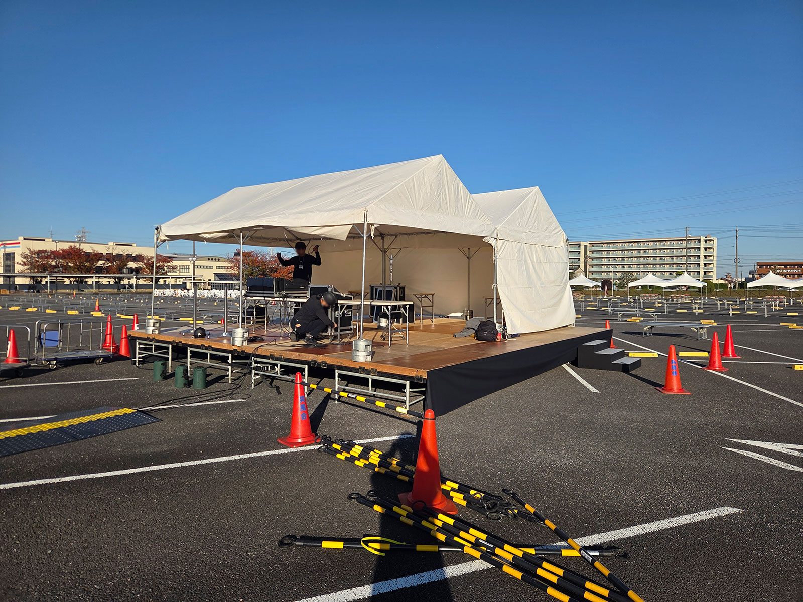 使用した商品:バックパネルステージ、イントレステージ、2×3間パイプテント(白)、軽量パイプ椅子