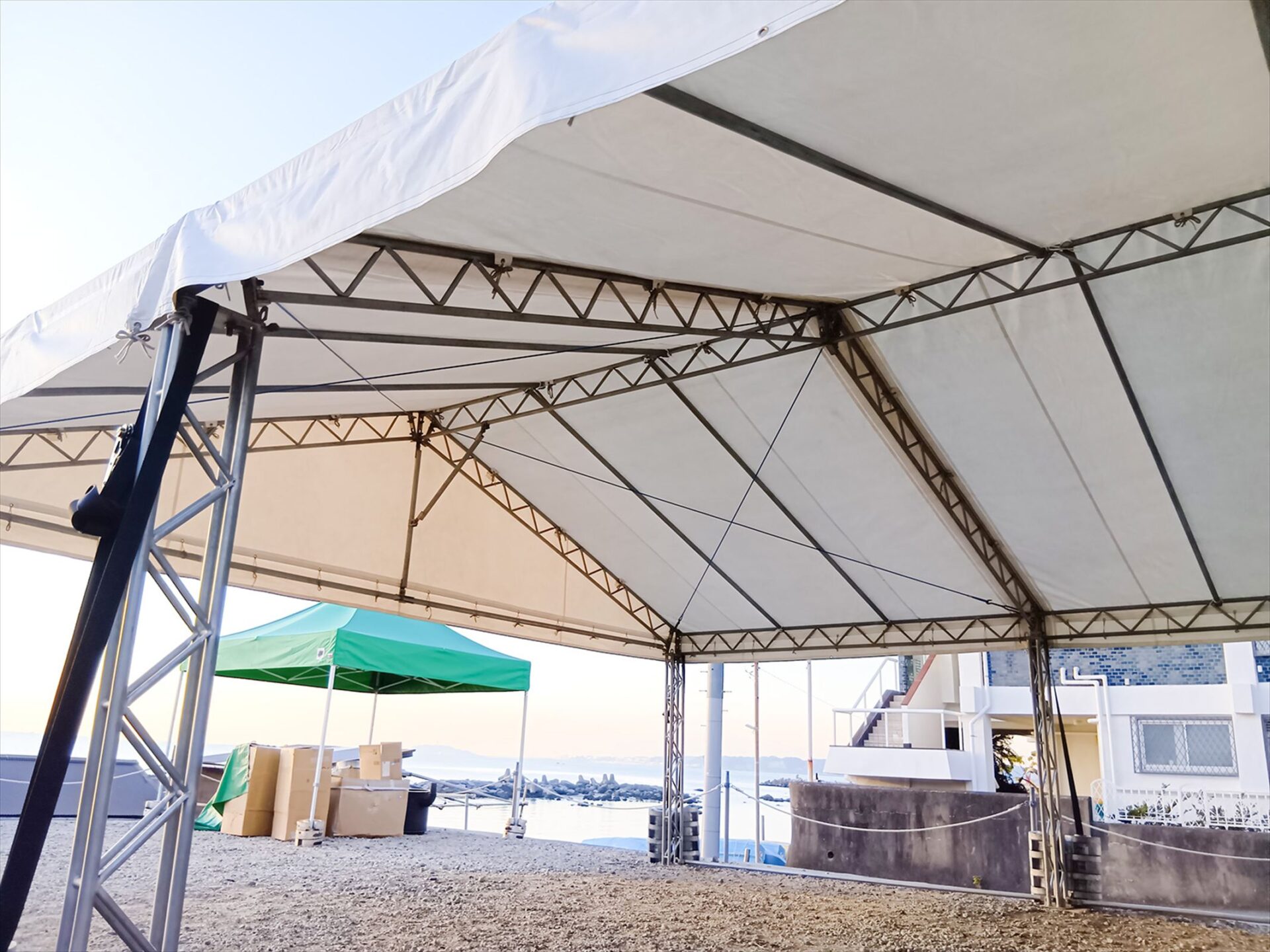 | セット内容 | 物品4✕8間トラス式テント×1張30kgウエイト×100個 経費関係車両配送費×2式設営費×1式 撤去費×1式 諸経費×1式 |