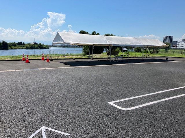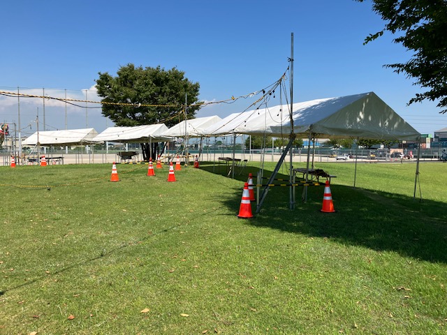 毎年夏に開催される蟹江町の夏祭りで使用したテントの一式セットをプランにしました!人工芝なので杭を打ち、ロープで固定する方法をとりました。一部テントはコンクリート上に立てたので鉄ウエイトを使用しております。現地にフォークリフトがない状態なので、ユニック車を手配しての対応になっております。