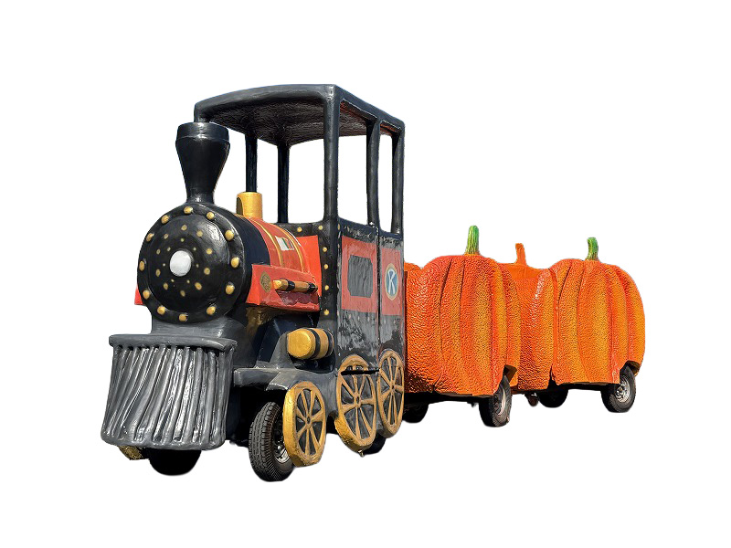 カボチャ型の客車が2両ついた、ハロウィンモチーフのかわいい乗り物遊具「ハッピーハロウィントレイン」は、最大4人まで乗車可能!レール不要で、会場に合わせた自由なコース設定が可能です。