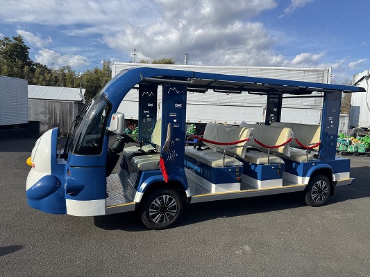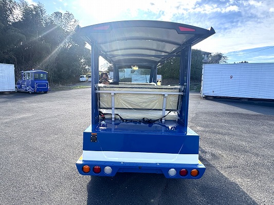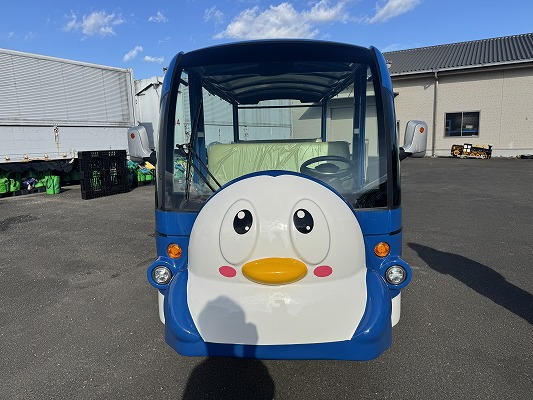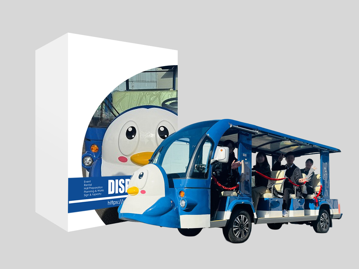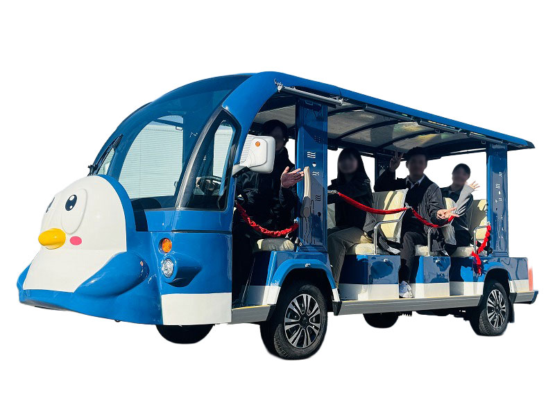 ペンギンをモチーフにした可愛らしい10人乗りトレイン。レール不要で自由にコース設定ができ、バッテリー式で排気ガスゼロ。屋根やシートベルト付きで安全性も高く、イベント会場の回遊や集客に活躍します。