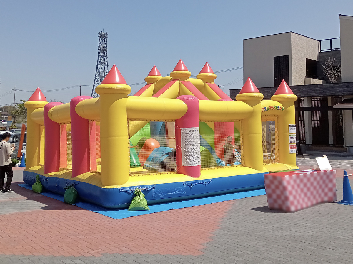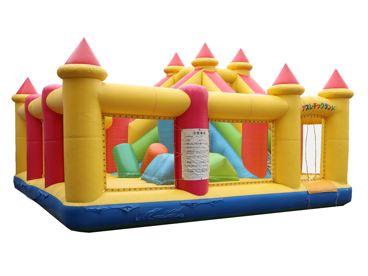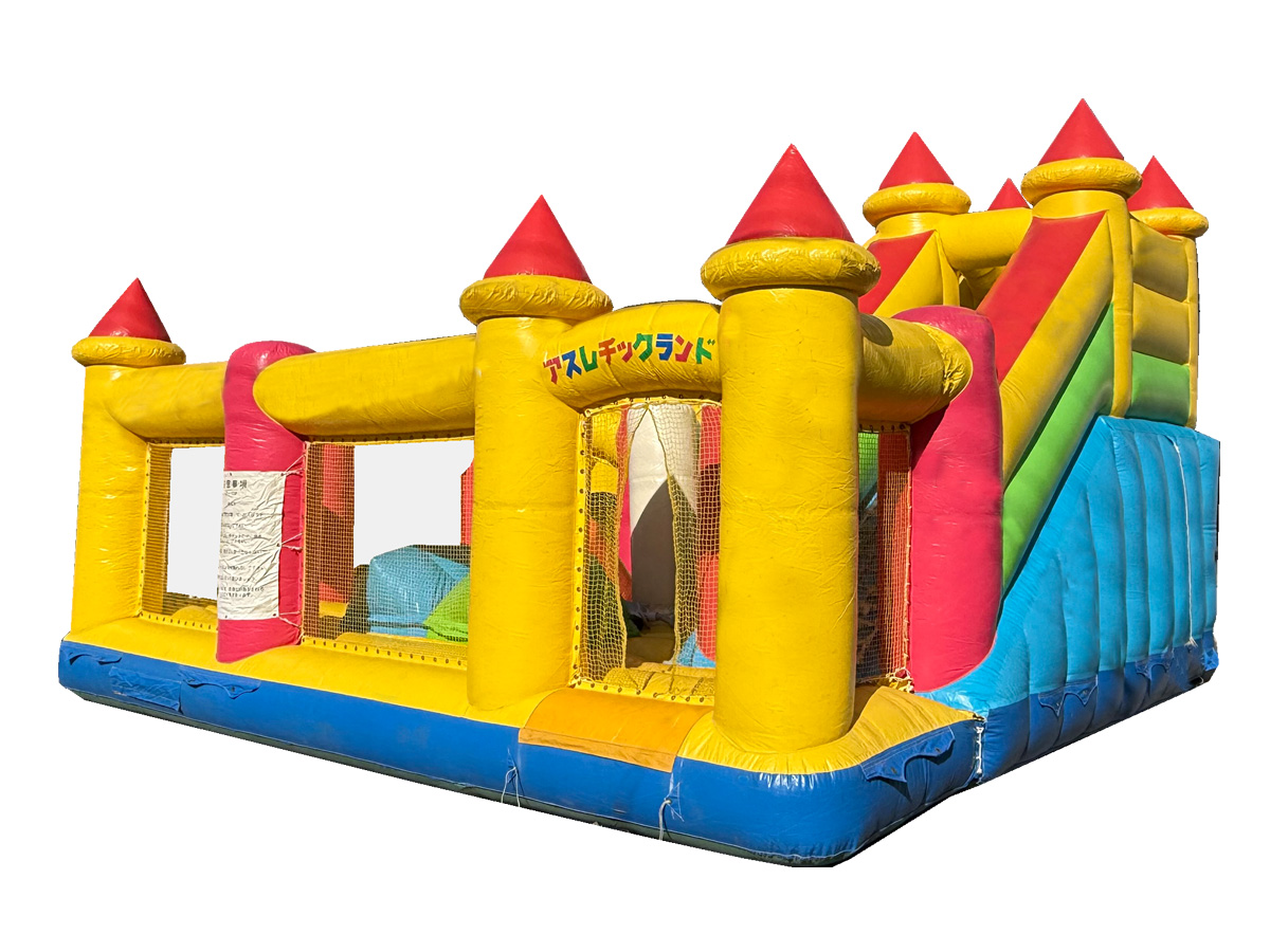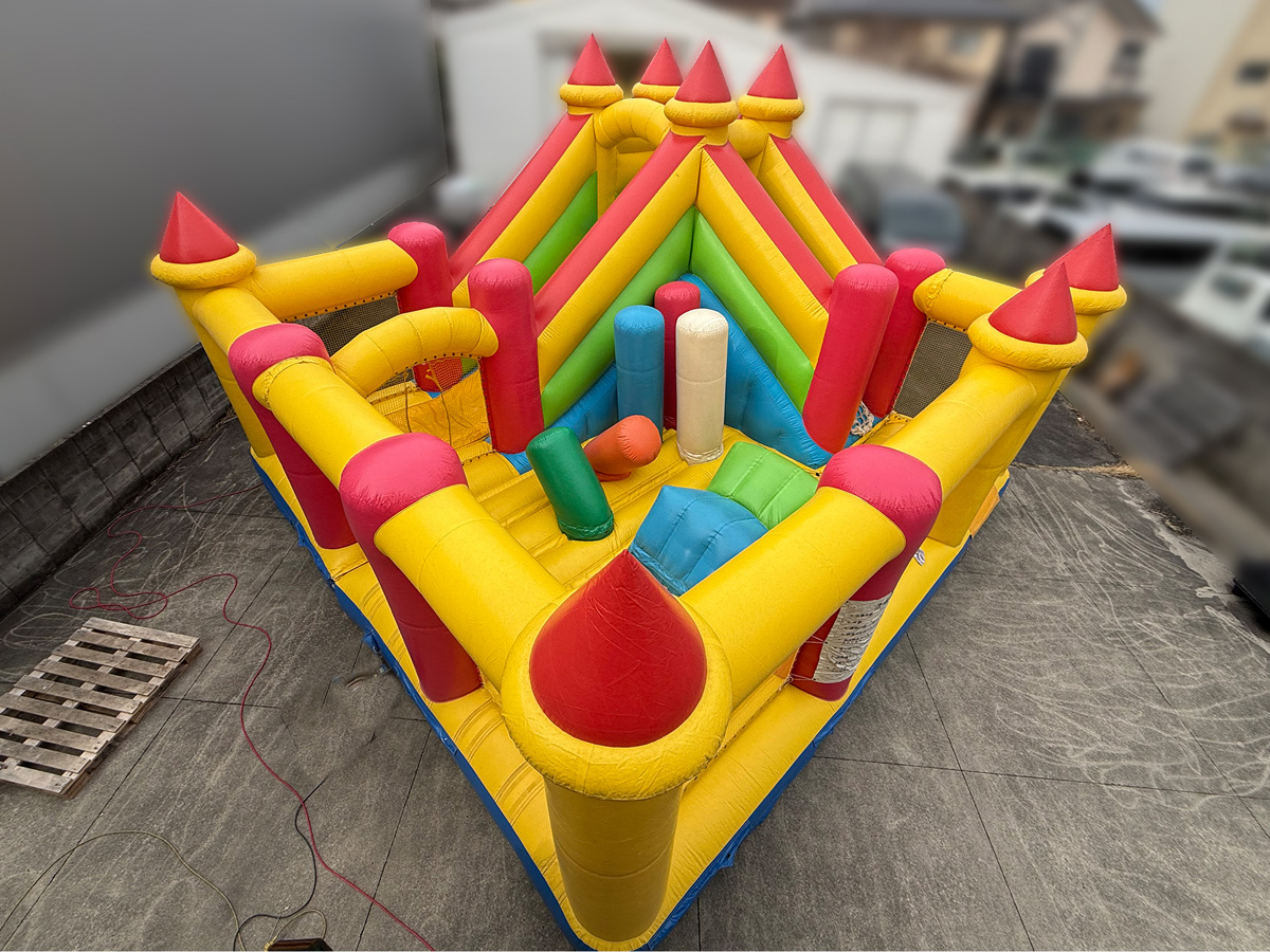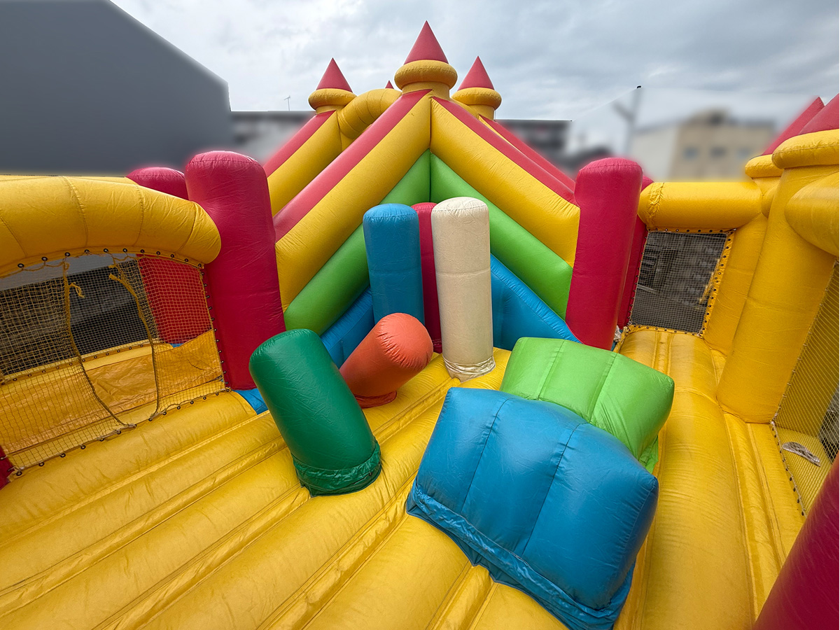 クッション性のある椅子やポール、滑り台など様々な遊具が入ったオープン型のエア遊具です。側幕はメッシュなので親御さんが中の様子を見れるので、安心してお使いいただけます!カラフルで、小さなお城のようにも見えるので子供たちの好奇心を刺激します!