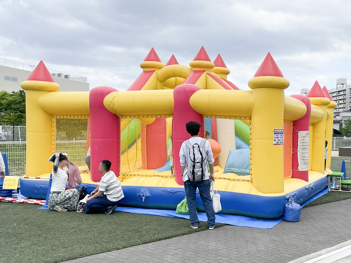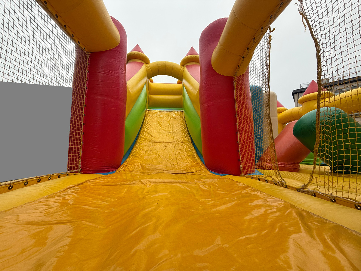 色んな遊び方ができるアスレチックが、エア遊具として登場しました!滑り台としても活躍できます!