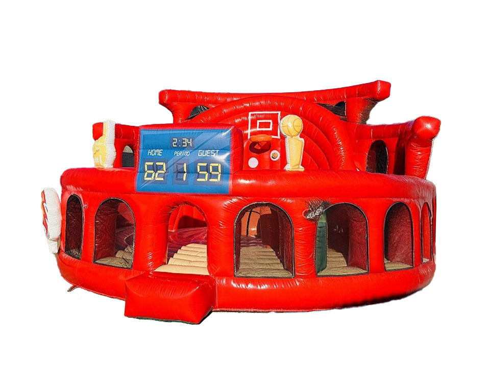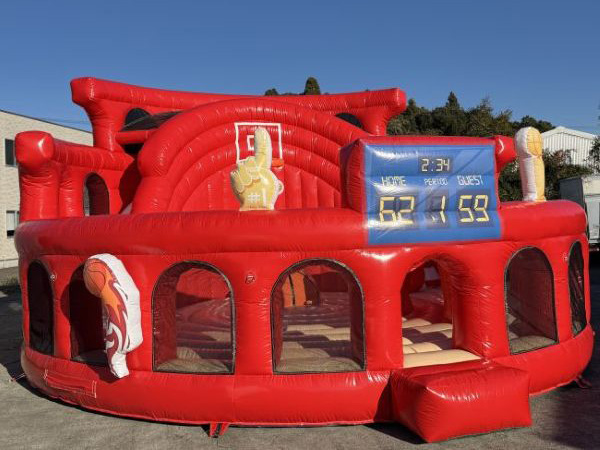 バスケットボールアリーナは、ジャンプしてボールを投げ、ゴールを狙って遊べるバスケットコート型のふわふわ遊具です。正面はもちろん、側面にも得点板やバスケットボールのイラストが描かれており、会場のどの方向からでも目を引くデザイン。背面にはスライダーも備え、投げる・跳ねる・滑るといった多彩な動きで、子どもたちを飽きさせません。付属のボールにはマジックテープが付いており、ゴールに貼り付けて遊ぶことも可能です。バスケットボールチームのイベントやスポーツフェスティバルはもちろん、商業施設の集客イベント、住宅展示場のアイキャッチにも最適。設営がスピーディーなため、ハーフタイムなど限られた時間での実施にも対応でき、イベント運営の自由度を高めます。