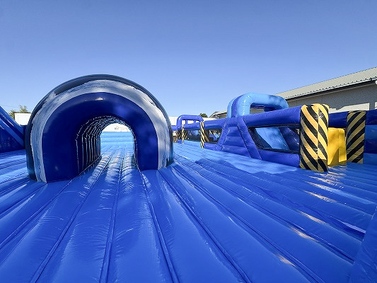 ③全て広げきったら、送風機を遊具につなげていきます。電源は1口必要です。送風口は10か所ございますが、5か所を塞ぎ電源に近いものを5つご使用ください。生地のねじれがないようにご注意ください。空気が入りにくくなる場合がございます。