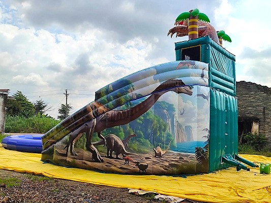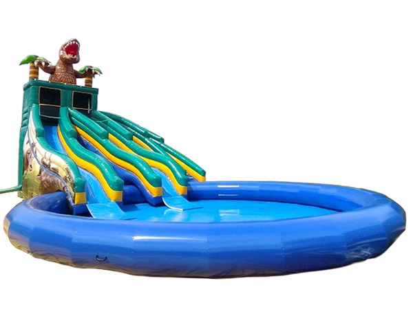 ダブルレーンの大型滑り台付きで、恐竜がアイキャッチになる全長17mの巨大ウォータープールです。