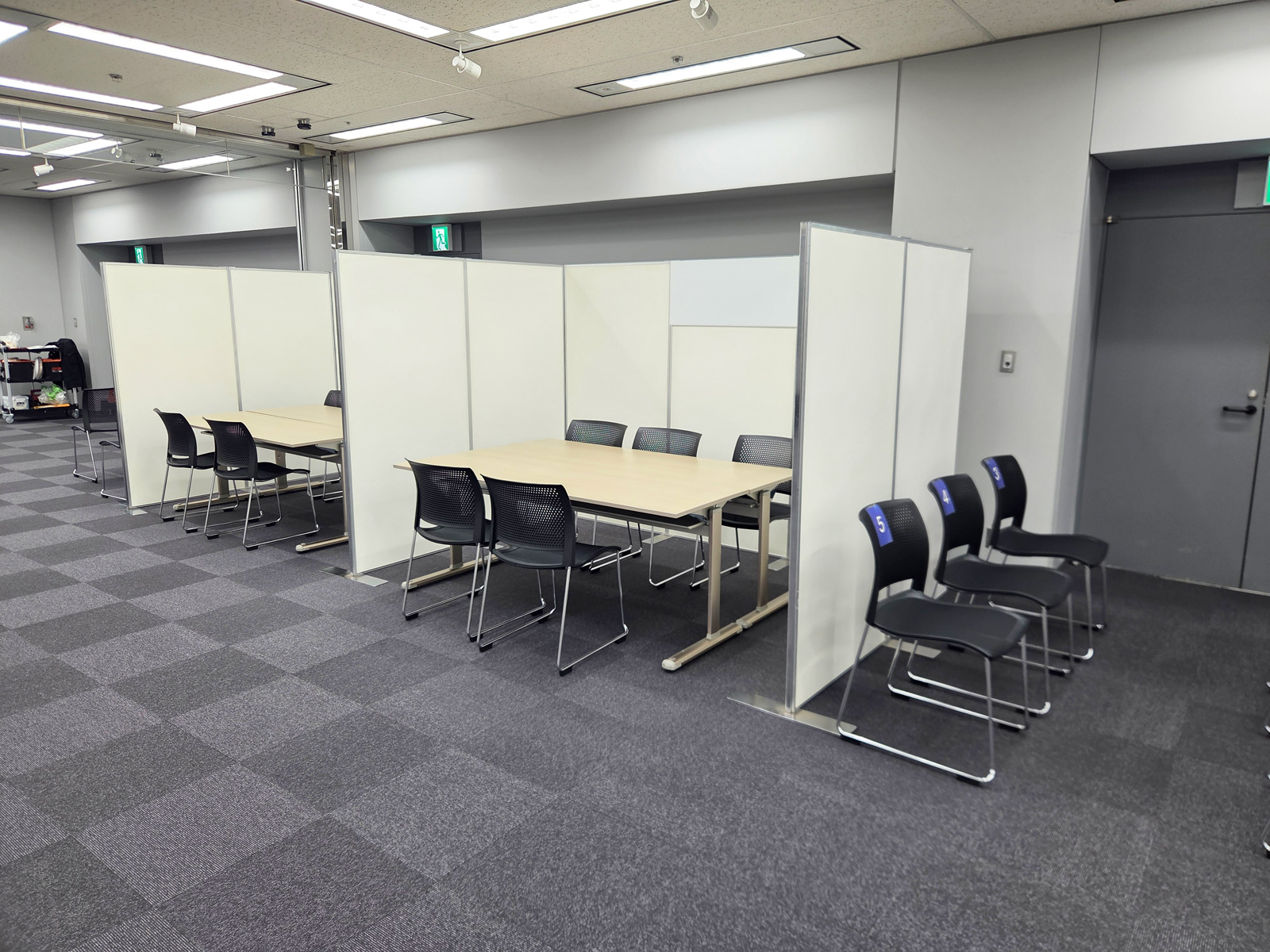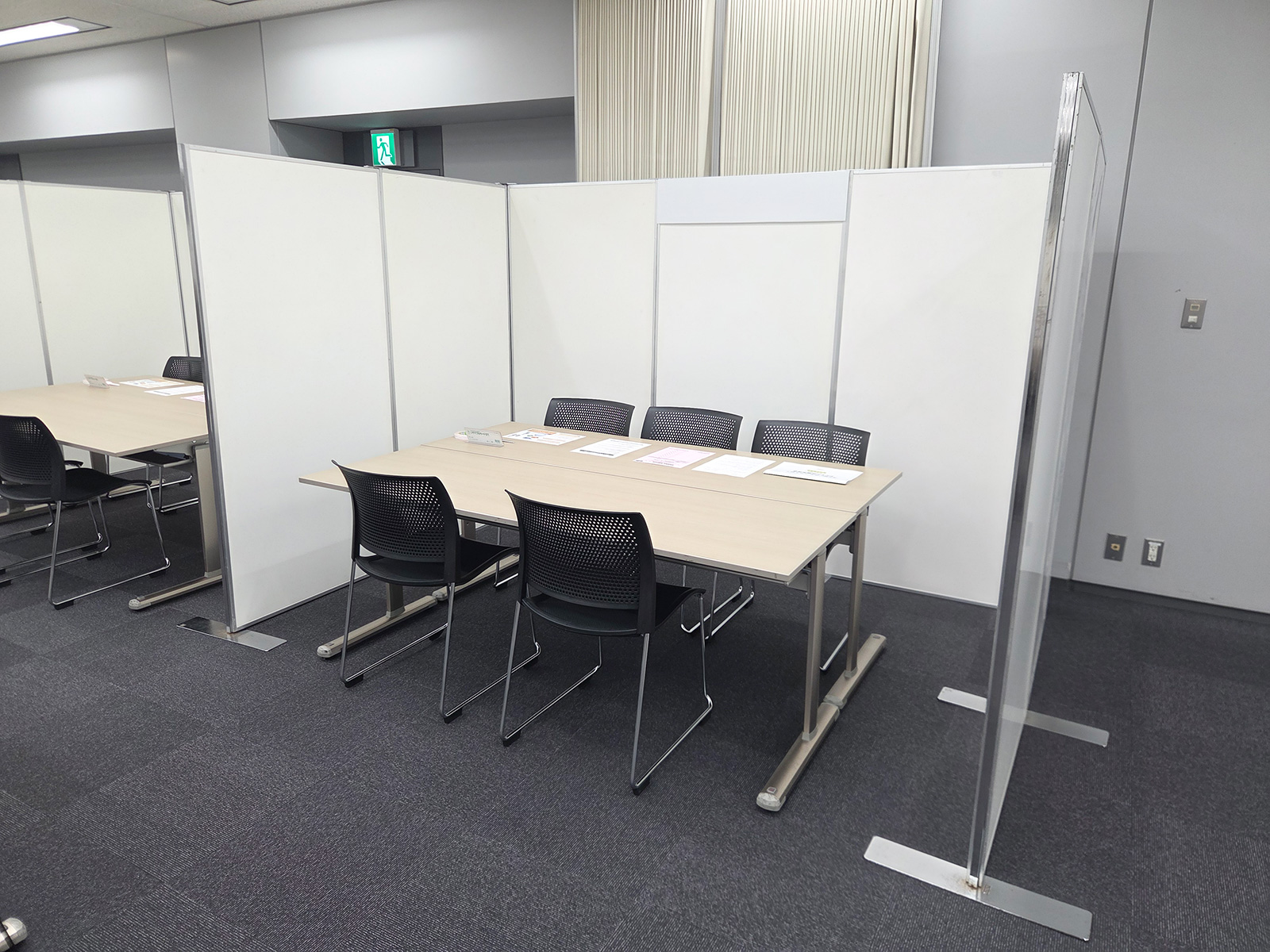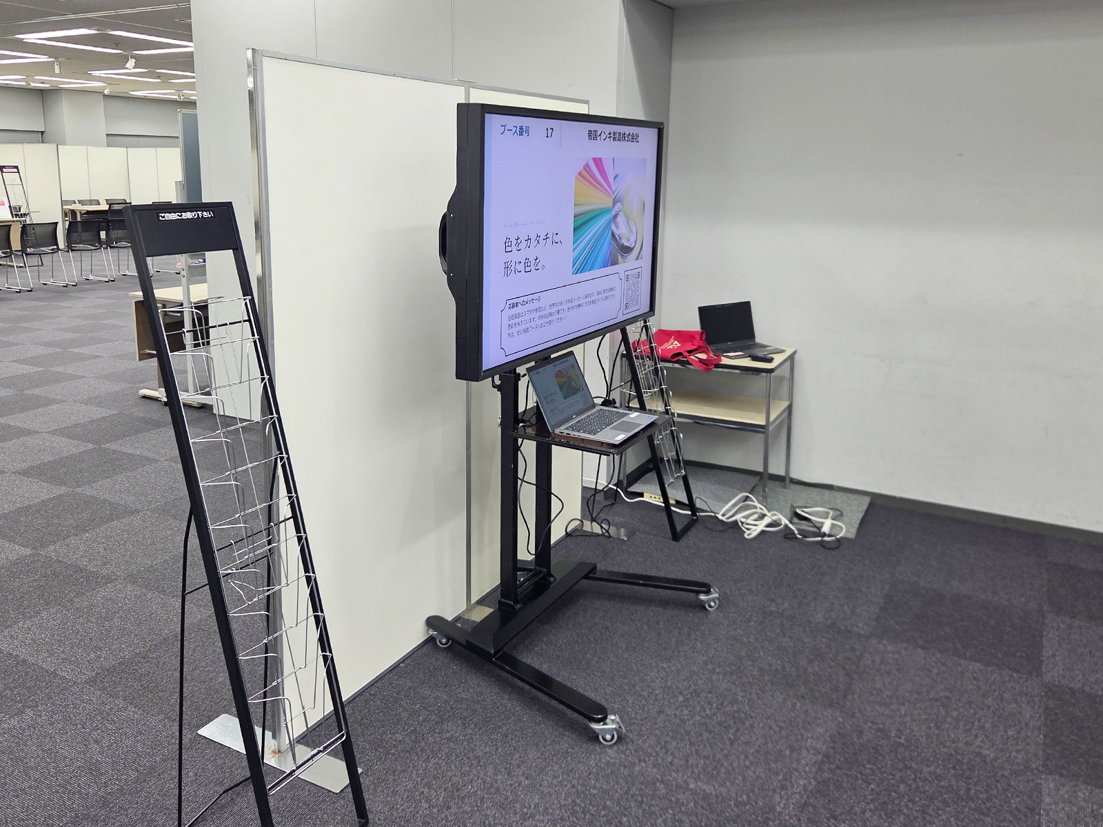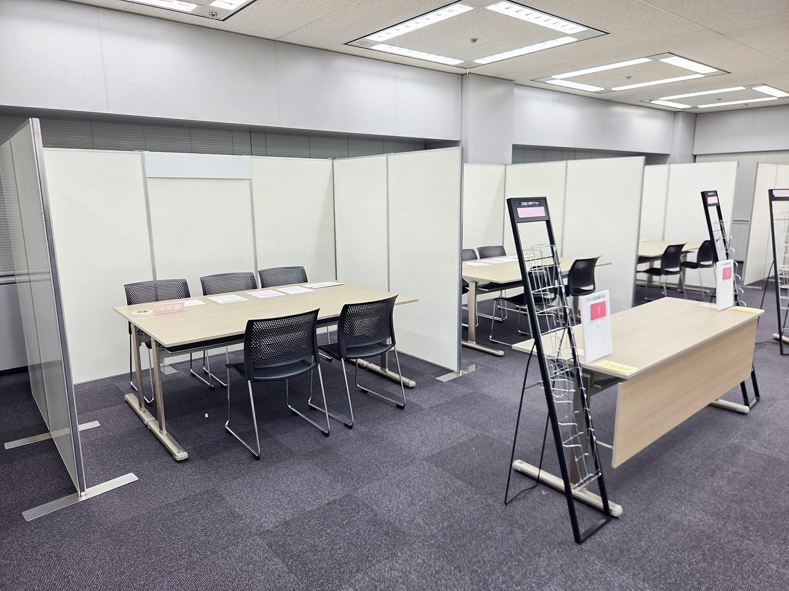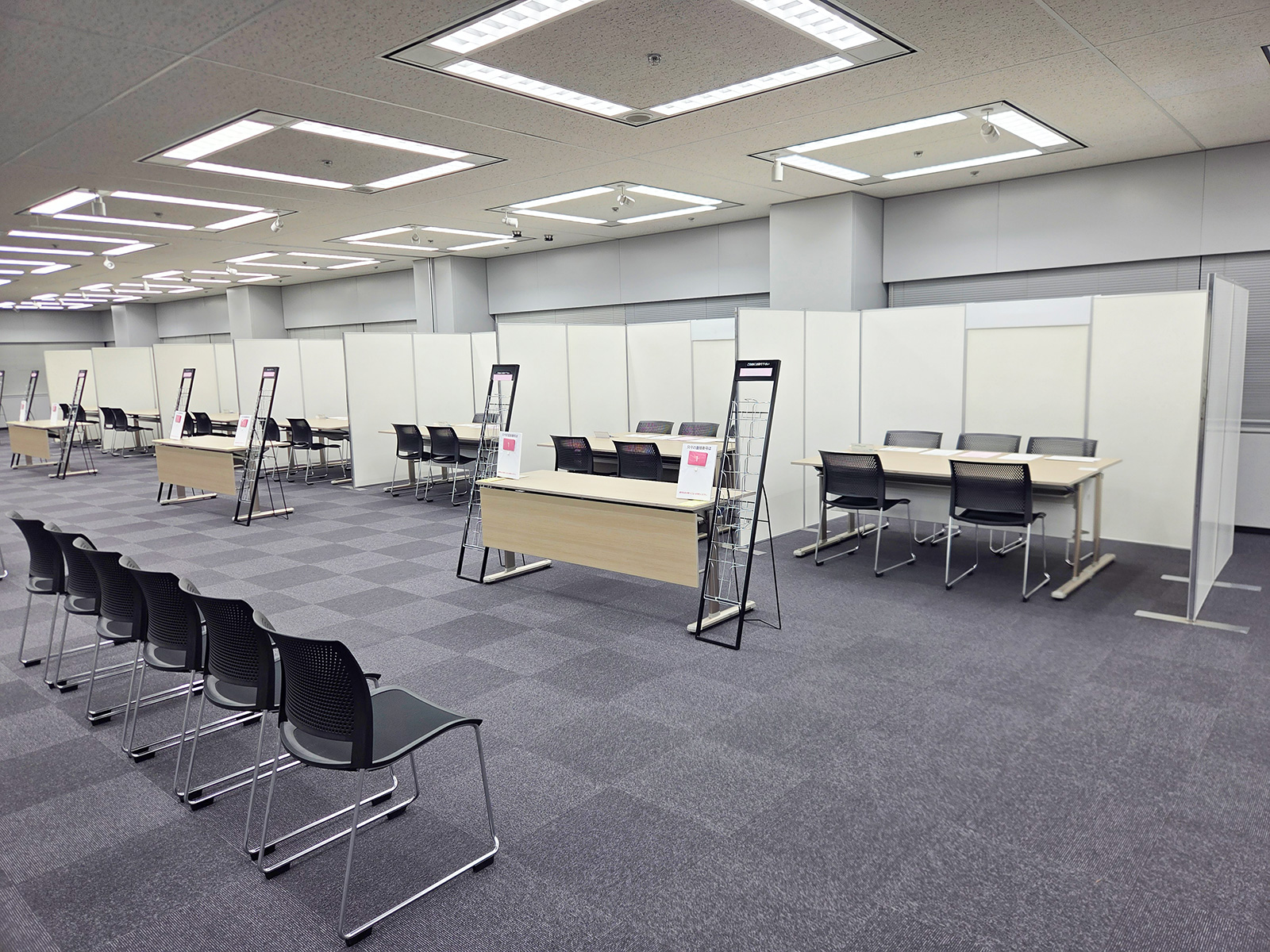 合同説明会に向け、定番のイージーパネルを用いてコの字型・T字型に各社ブースを設営し、見通しと動線に配慮した配置としました。来場者が資料を手に取りやすいよう10段のカタログスタンドを設置し、6列5段のパイプ椅子を2セット用意。さらに50インチ液晶ディスプレイと専用スタンドを設置し、視認性の高い説明環境を整備しました。