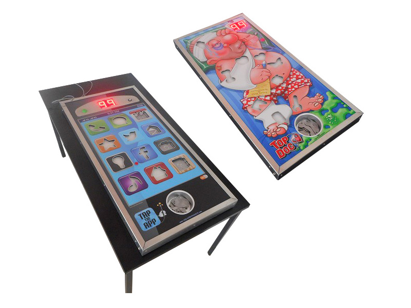 枠に当たらないように丁寧に棒を使ってアプリのアイコンを取り出すスマホ電流ゲームと、ポップな絵柄の怪我人の体の部位を取り除いていくドクター電流救出ゲーム。同じジャンルのゲームを楽しめるアーケード向け電流ゲームセットです。