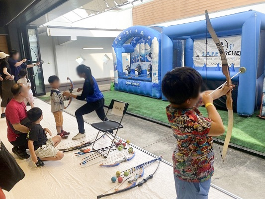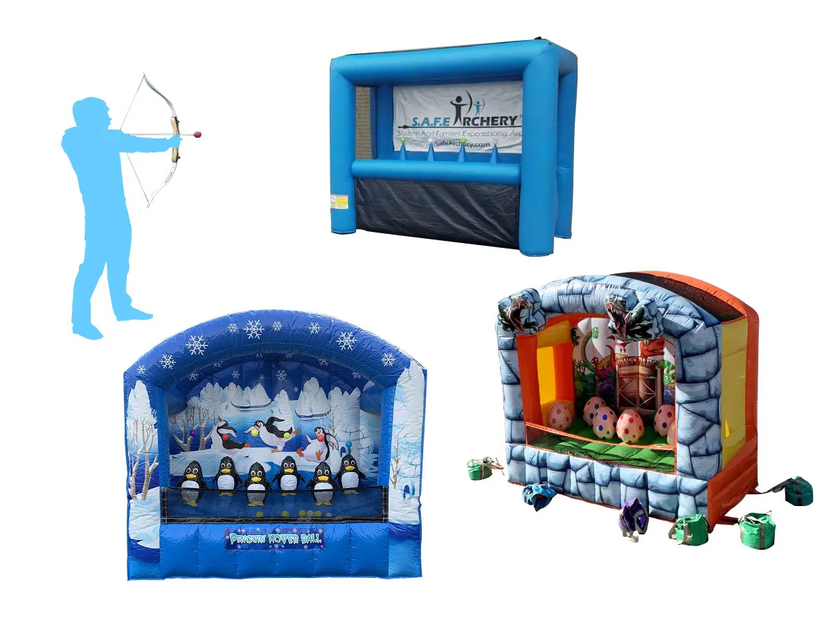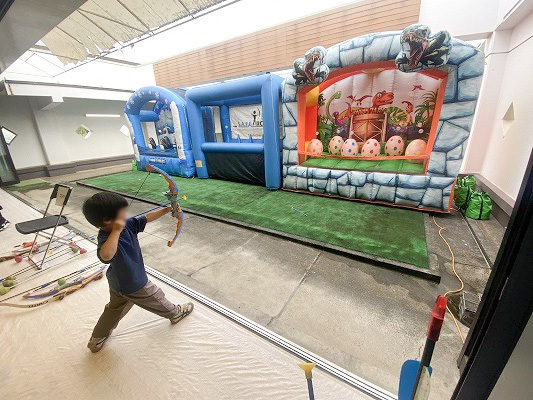 エアー後からで浮かぶ浮かぶボールに向けて弓矢を離すエアー式ゲームの3点セットです。ペンギンや恐竜の卵から浮かぶ可愛らしいデザインで、子供たちから大人気です!