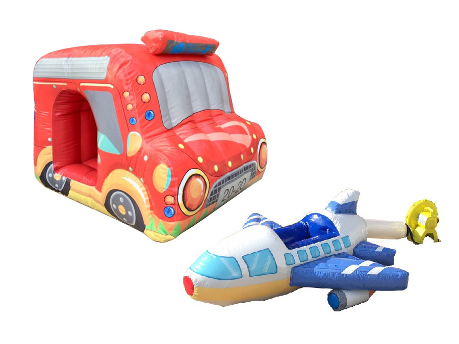 飛行機と車。乗り物がコンセプトのフォトバルーンセットです。エア遊具のように飛び跳ねたりして遊ぶことはできませんが、お子さんを乗せて記念撮影する時に使用しますので親子連れのお客様が多く集まるファミリーイベントや、子供服の展示会などにおすすめです。