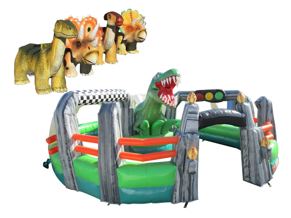 様々な恐竜のバッテリーカーと、エアーで膨らむレースコースのセットです。真ん中には迫力満点の恐竜が牙を剥いて、ちびっこ達をお出迎えします。そのままぐるっと一周して、入口と同じ地点を目指しましょう。