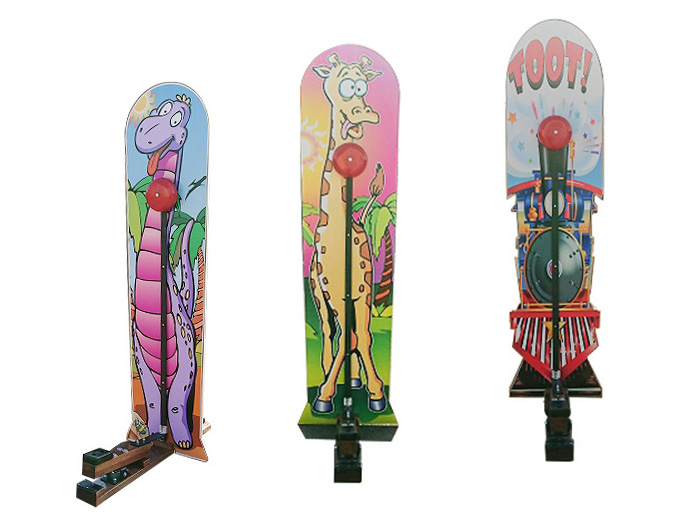 足元をハンマーで打ち付けて、鐘を鳴らす有名なゲームです。絵柄は3種類。親子連れのお客様が集まるイベント会場にどうぞ!