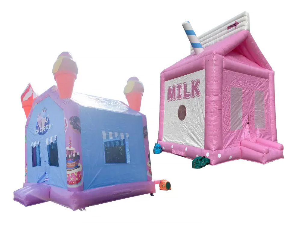ミルクがモチーフの、かわいらしいエアバウンスセットです。どちらも家型で、清涼感のある仕上がりです。牛乳をモチーフにしたイベントにいかがでしょうか?