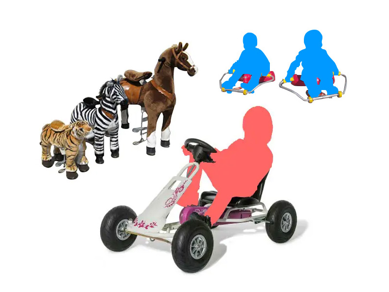 バッテリーがなくても、体の動作だけで動かせる乗り物を集めました!オーソドックスなペダル式カート、手で動かすローラーレーサー、動物に乗るアニマルライドなどユニークなものが勢揃いです!