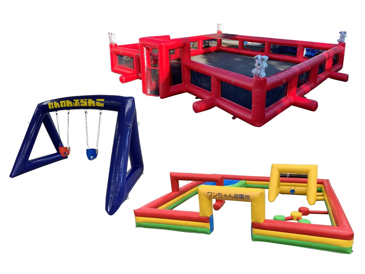 ワンちゃんや猫ちゃんと一緒に遊べる、エアー式のアトラクションゲームセットです!ブランコやドッグランができるフィールド、遊園地などで目一杯はしゃげます!