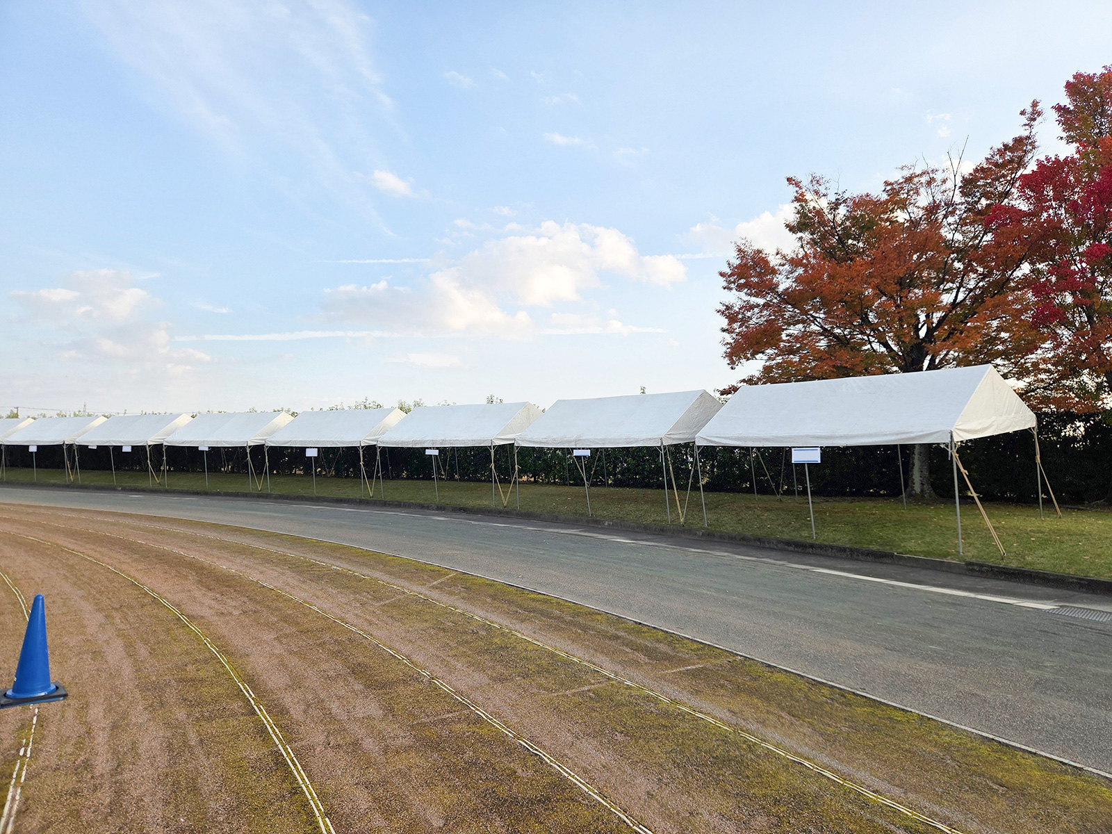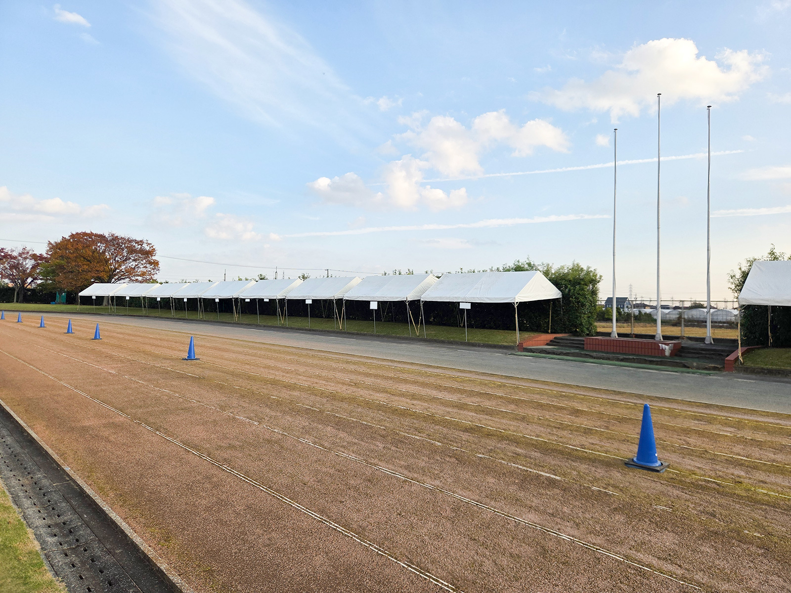 会場は稲沢市陸上競技場で行われました。それぞれ、本部、更衣室、測定所、音響室、休憩室をメインに設営したのですが、中でもパイプテントが今回、大活躍しました!トラック内側はウェイトで養生し、外側の足元は土なので杭・ロープを使用してしっかりと安定させてマラソン大会は本番を迎えました!